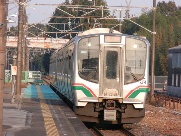 駅に入線するE721系。ホームの高さは760mmと低く、低床車のE721系でも段差が生じる。