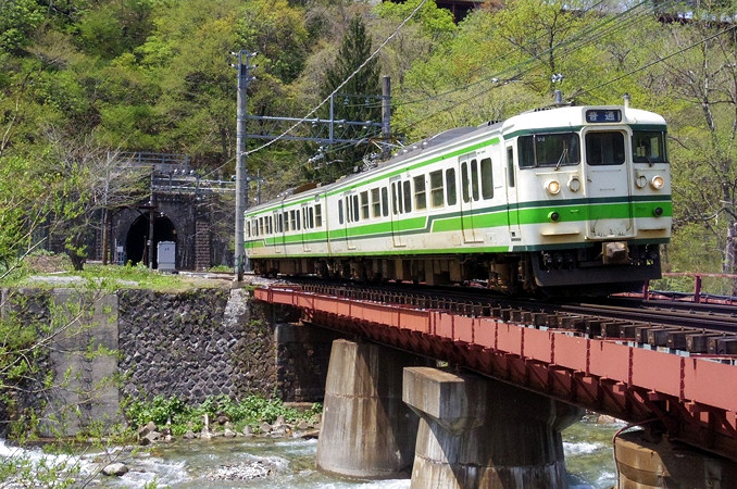 土樽〜土合間(清水トンネルポータル付近)を走行する新潟色の115系。