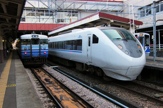 越後湯沢駅に停車中の115系と681系特急「はくたか」など。