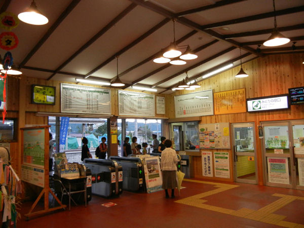 長野県産杉材を使用したレトロ調の待合室。観光客を裁くためか、自動改札機が設置されている。