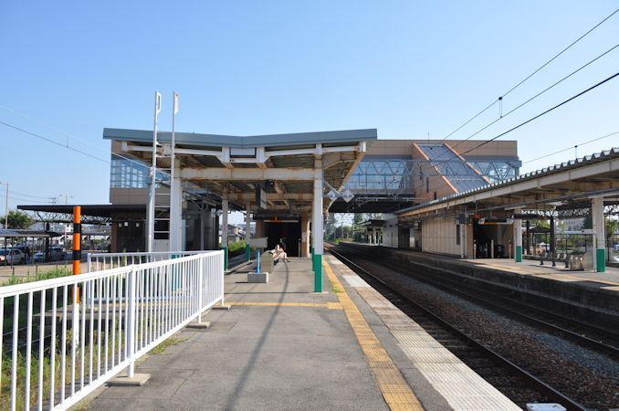 旧豊栄市の中心駅で、2面3線のホームを持つ橋上駅。2006(平成18)年3月25日に現駅舎の使用を開始し、この際に北口が誕生している。