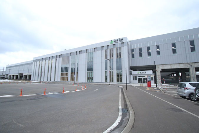 在来線と反対側、北側に設けられた北海道新幹線の駅舎。デザインコンセプトは「波と森のプロムナード 〜北の交流発信地〜」であるが、駅前広場がガランとしているなど、ちょっと殺風景な感じ?