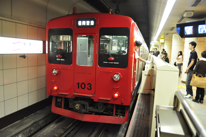 福岡市営地下鉄ホームに停車中の103系。(撮影:裏辺金好)