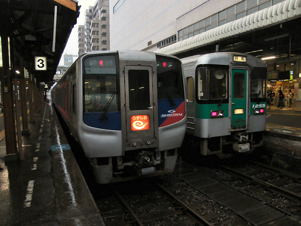 高徳線の2000系特急「うずしお」と、牟岐線の1200形ディーゼルカー。