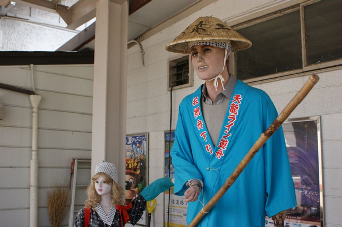 ホームには名物の天竜川ライン下りのPRするための人形があるのだが・・・。