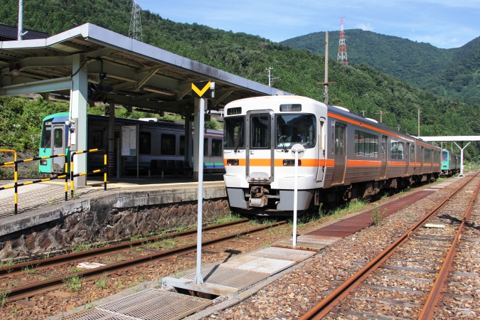 JR東海とJR西日本の境界駅である猪谷駅。キハ25形とキハ120形の並び。