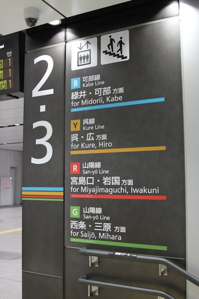各ホームへの階段脇も分かりやすく整理。2・3番線の場合は芸備線以外全ての列車が発着することからこんな表示になっています。