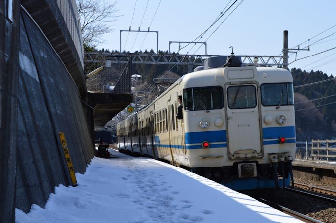 駅を発車する413系。上りホームは崖が迫り、圧迫感を感じる箇所もある。