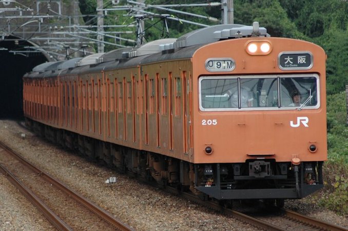 生瀬駅に入線するオレンジ色の103系。