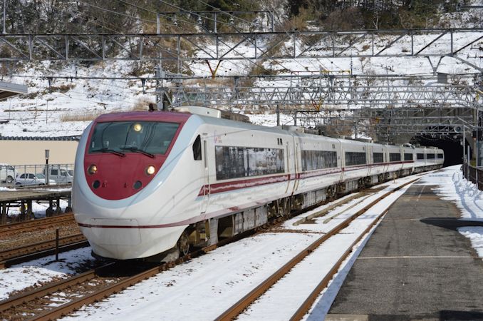 津幡〜倶利伽羅間。冬の倶利伽羅峠を走行する485系「北越」。