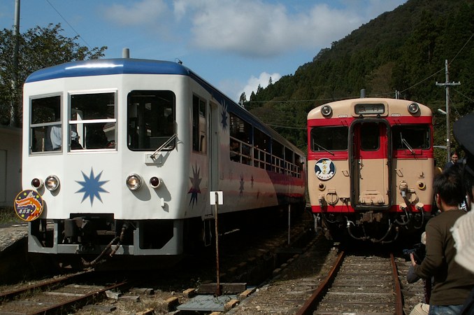 出雲三成駅で交換する「奥出雲おろち号」とキハ120形。