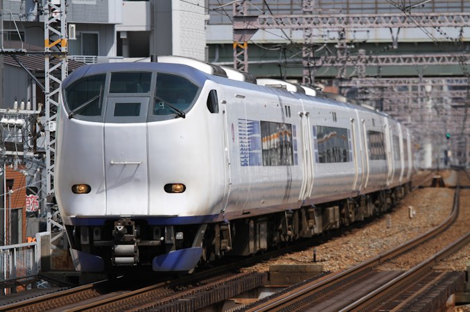 野田駅を通過していく287系特急「くろしお」。パンダくろしお使用にラッピングされており、インパクト抜群。