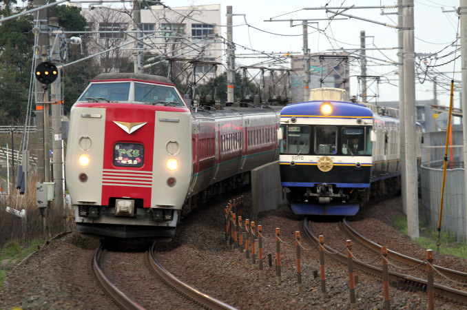 出雲市〜直江間で381系特急「やくも」と一畑電車が並走。