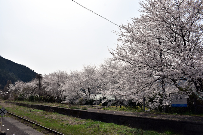 ここも桜が満開でした キハ120-312 米ハタ 9428D 石見松原駅