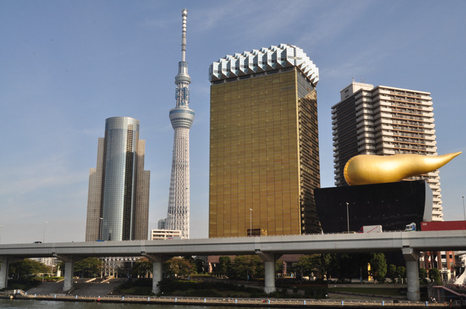 特徴的な金色のアレに加え、東京スカイツリーも浅草駅近くからよく見える。