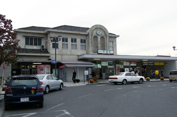 東口駅前の様子 橋上駅の改札口。改札口横の巨大な時刻表が目立つ・・・。