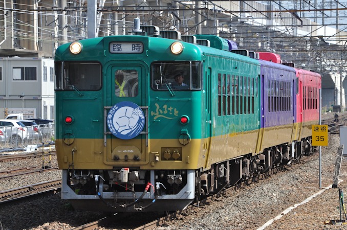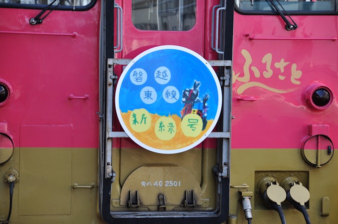 2015(平成27)年5月23日・24日、磐越西線郡山〜いわき間で、キハ40系ジョイフルトレイン「ふるさと」を使用した臨時快速「磐越東線新緑号」が1往復ずつ運転されました。特製のヘッドマークが両端異なるデザインで掲出されています。写真はいずれも郡山駅にて。