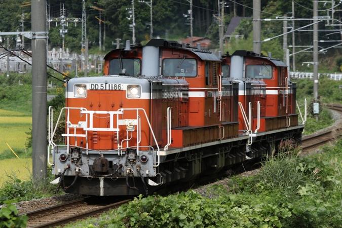 まずは牽引機のDD51送り込みから。伯備線の根雨〜黒山にて、9時ちょうどにようやくやって来ました。緩いながらも上り勾配ということで、2両とも排煙を噴き上げています。