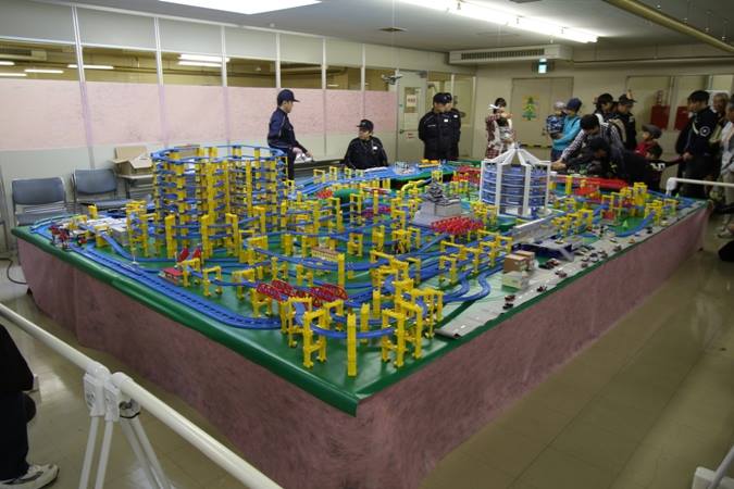休憩スペース横に展示されたプラレールの巨大ジオラマ。