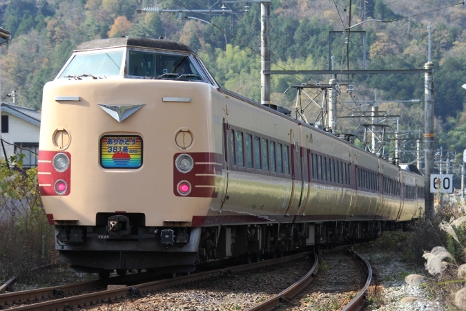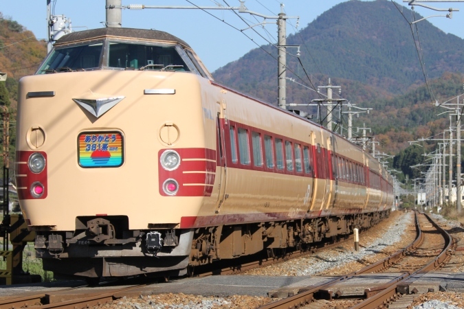 2015(平成27)年11月28日、日本旅行の主催で「ありがとう381系国鉄色の旅」が11月7日に続いて運転されました。往路が新大阪〜和田山〜城崎温泉、復路が城崎温泉〜京都で、今回のトレインマークは「あさしお」と、同マークを模した「ありがとう381系国鉄色」が各々掲出されました。(解説&撮影:ひょん君)