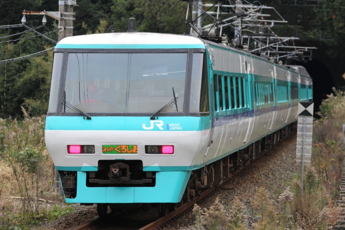2015(平成27)年12月6日、新宮→天王寺間にて381系を使用した団体臨時列車「ありがとう381系 きのくに線」が運転されました。新宮方(パノラマグリーン車)は「スーパーくろしお」表示、天王寺方は「スーパーくろしお」の絵柄を利用したツアー名が記載されたトレインマークが掲出されています。これを以って、近畿圏における381系の運用が終了しました。(撮影:ひょん君)