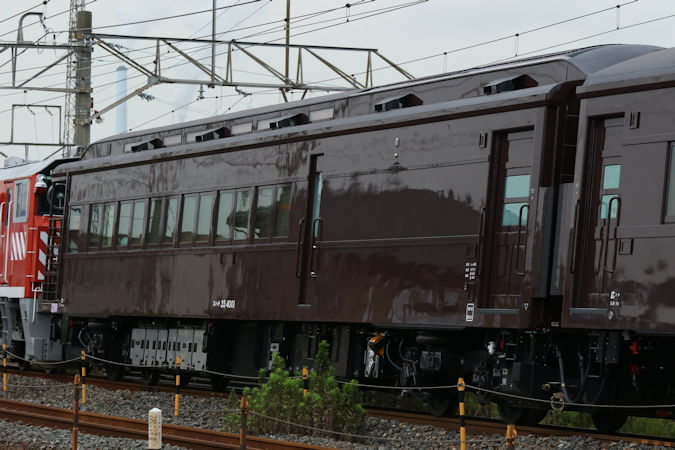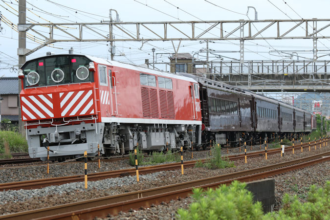 2017(平成29)年7月5日、キヤ143+35系+キヤ143の編成で新山口〜下松間で試運転が行われました。キヤという形式ながら、見事に機関車・・・。なお、この日以外にも連日のように試運転が実施されているようで、9月のデビューに向けた準備が進められています。(撮影:リン)