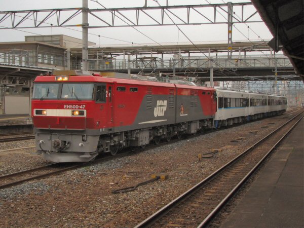 門司駅にて。関門間ではEH500-47が担当していました。すなわち、今週から関門間で動き始めたEH500(金太郎)ですが、本日の松浦鉄道用の甲種回送にも抜擢されて撮影者の注目を浴びていました。(撮影:さがみ様)