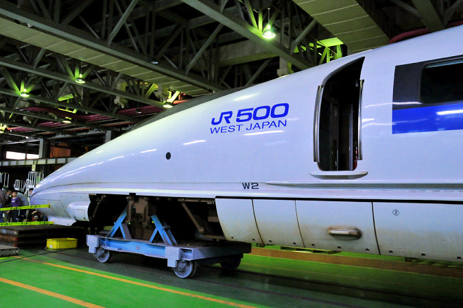台車が外されジャッキ・アップされた500系。(撮影:kajibooh様)