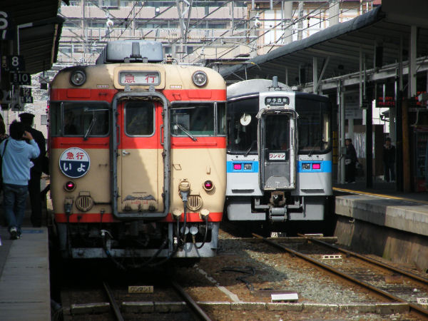 松山から宇和島へは、長浜経由の定期普通列車としてキハ185系3000番台との4両編成で到着。これに乗れば、特別料金不要で松山〜宇和島を堪能できたわけで・・・。