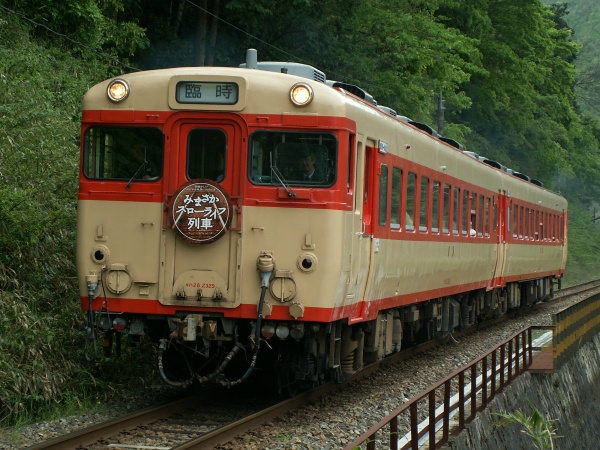 2009年5月8日、因美線津山〜智頭にて臨時列車「みまさかスローライフ列車」が運転されました。2007年春の運転開始以来、ローカル線である同線の活性化を担う存在として運行されており、乗車率も上々のようです。車両は前回と同じく岡山電車区所属のキハ58系国鉄色編成が専用ヘッドマークを装着の上で使用されています。
