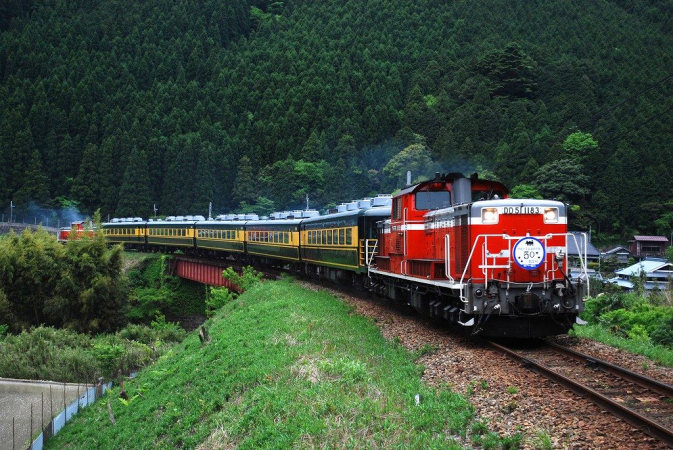2009年5月16日、宮原(操)〜豊岡(うち客扱い神戸〜豊岡、播但線経由)間で、「サロンカーなにわ」を使用した「甲南大鉄研50周年号」が運転されました。大サロ(サロンカーなにわ)は播但線の車両有効長の関係で3・4号車脱車の5両で、山陽本線←→播但線でスイッチバックする姫路駅での機回しが出来ないため、全区間DD51のプッシュプル運転となりました。