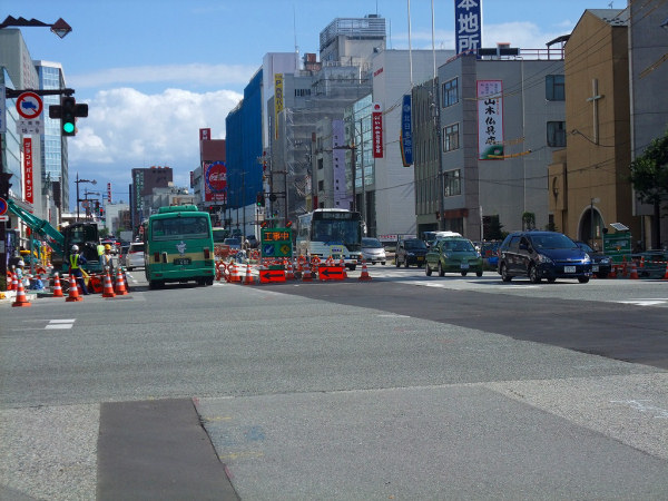 実は、越前町交差点から、西町交差点までは、昔路面電車が走っていました。また、一番町交差点から西町交差点にかけては、軌道の敷設が進んでいます。道路に比べ、かなり軌道の位置が高いのが気になりました。