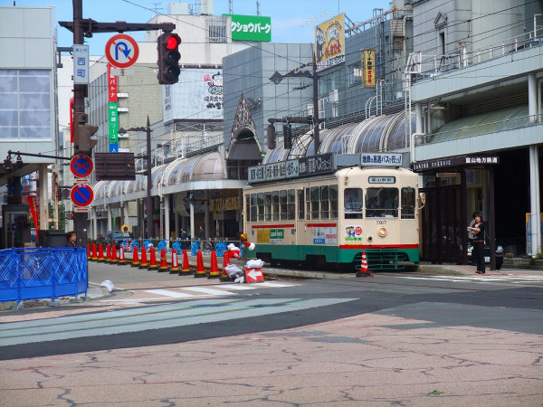 向こうからやって来た路面電車の方向幕が「富山駅前」になっているのは間違いですが(本来は「南富山駅前」)、ここを右折して富山駅前行きになる電車も将来できるのかもしれません(笑)。まあそのころにはさすがに7000系は引退しているでしょうが(爆)