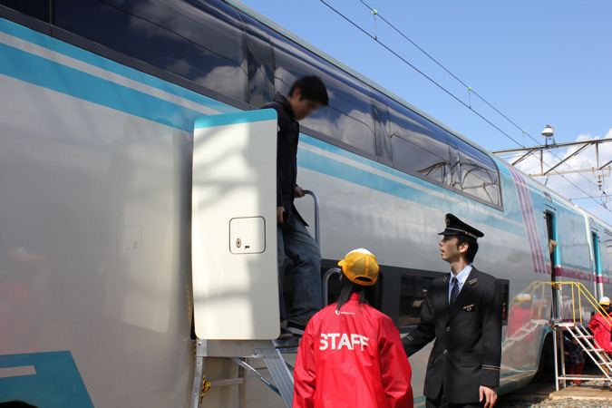 20000形の車内見学は、なんと非常口から降りるという趣向。
