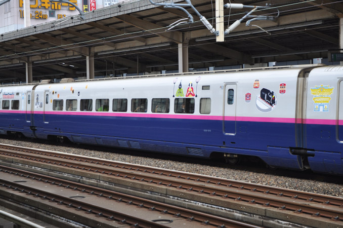 おまけ:新幹線YEAR2012の企画として、Suicaペンギンが沿線を案内する「ご当地ラッピング新幹線」がE2系に施されています。こちらは福島県を描いたもの。