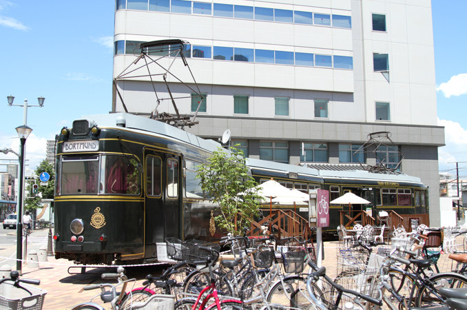 2012(平成24)年7月11日より、ドルトムント電車として親しまれてきた広島電鉄70形(76号)が、広電本社前にある広電系列のスーパーマーケット「マダムジョイ千田店」にてイートインスペースに転用されました。これに合わせて内装をリニューアルし、車体塗装を濃緑色に変更したほか、片側の運転台が撤去され貸し切りスペース「LUXE」としています。