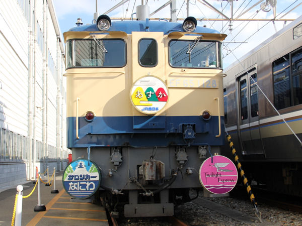 2012(平成24)年11月3日、JR西日本網干総合車両所で、「網干総合車両所ふれあいフェア2012」が開催されました。展示車両はEF65−1128、マイテ49−2、オヤ31−31、24系トワイライトエクスプレス、115系、207系、221系、223系でした。なお、EF65には宮原総合車両所から持参されたトワイライトエクスプレス・あすか・サロンカーなにわ(純正)・ あさかぜ(九州仕様)を取り付ての撮影会が実施されています。