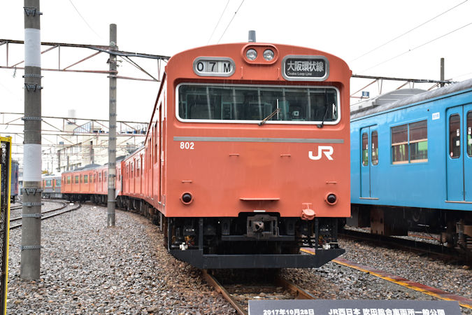 2017(平成29)年10月28日、JR西日本で「吹田総合車両所一般公開2017〜お客様・地球に愛される、吹田総合車両所〜」が開催されました。今回の目玉は、103系が3色そろい踏み。先日引退した大阪環状線の103系LA4編成のほか、阪和線で活躍したHK606編成(先頭車のみ)・奈良線のNS618編成が並べられています。このほか、12系「あすか」や24系「トワイライトエクスプレス」、201系と323系の並びなど、様々な車両が展示されています。