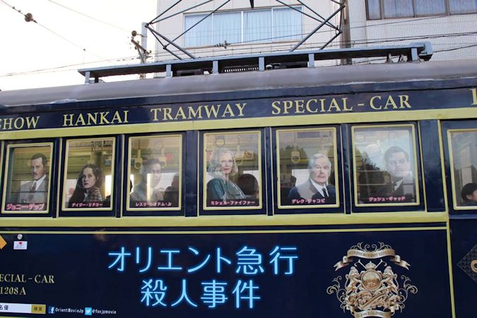 阪堺電気軌道166号が映画「オリエント急行殺人事件」ラッピングで運行中