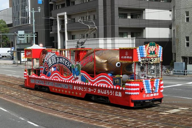 広島電鉄で広島カープの「セ・リーグ3連覇記念」花電車が運転中
