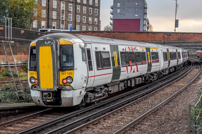 Gatwick Express向けClass 387/2のメンテナンスによる編成不足を解消するため、同じGTRグループのGreat NorthernからClass 387/1の387105編成がガトウィック運用に11月から投入されました。これは中期的な措置のようで簡易GXラッピングが側面に施されています。
