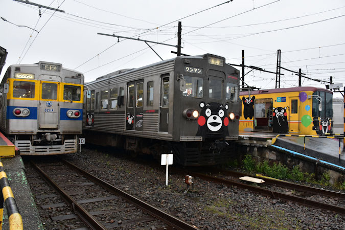 東京メトロ日比谷線の03系のうち、さっそく1本が熊本電鉄に譲渡され、2両編成となって登場しています。現在は試運転中のようですが、銀座線の01系を導入した当初のように、日比谷線時代の塗装などを残している状態です。おまけで「目黒」の表示を出している5000系や、くまモン電車3種類を・・・。