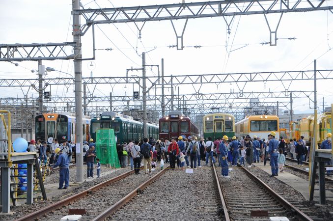 きんてつ鉄道まつりin五位堂の風景。左から阪神1000系(1210F=阪神・近鉄相互直通10周年ラッピング車)、8400系(8409F=田原本線開業100周年 初代600系復刻塗装車)、8400系(8414F=田原本線開業100周年 820系復刻塗装車)、1430系(1438F=三重交通復刻塗装)、モワ24系(電気検測車はかるくん)。