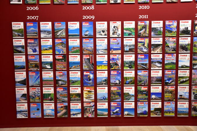 時刻表ライブラリー。1964年から現在までの時刻表がズラリと展示。