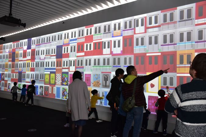 全国19の鉄道会社、全29の車両扉をスクリーン上に展示。触れると開くようです。