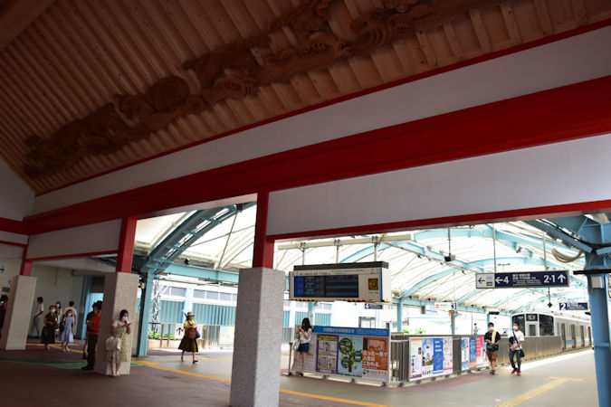 2020年(令和2年)7月30日に小田急の片瀬江ノ島駅の新駅舎が全面的に供用を開始しました。戦前に建てられた竜宮城風の旧駅舎の雰囲気を残しつつ、竜宮造りといわれる神社仏閣の技法を取り入れパワーアップした感じ。