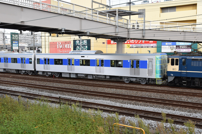 2020(令和2)年10月31日から11月2日にかけて、都営三田線用の新型車両6500形6501Fが製造元の近畿車輛から甲種輸送されました。吹田(タ)まではDE10-1571、以後はEF65 2096号機が牽引しています。なお、6500形は従来の6300形置き換えのために投入される車両で、6両編成から8両編成に増強。システム面では都営地下鉄では初となる走行中の車両各装置の動作情報を車両基地に伝送できる車両情報管理装置を搭載したほか、SiC素子を使用したVVVFインバータ制御を採用。「人にやさしい車両」として車いすやベビーカー、大きな手荷物を持った人の利便性を高めるべく、全車両にフリースペースを設置したほか、座席幅の拡大、袖仕切りの大型化、車内Wi-Fiサービス、全車両への防犯カメラ設置などが特徴です。