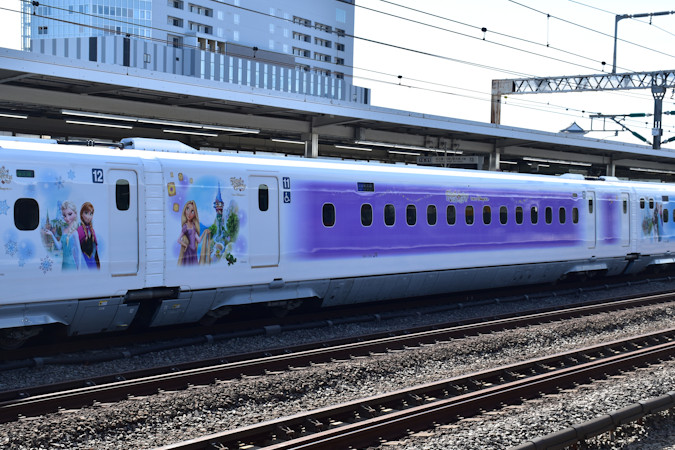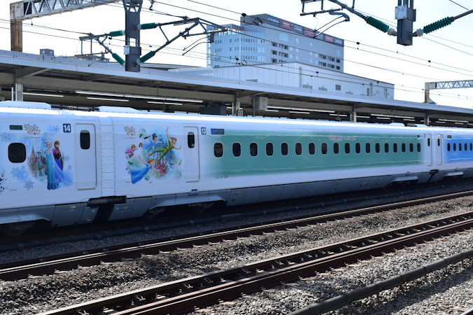 2025(令和7)年2月21日(金)〜2025年9月中旬の予定で、東海道新幹線のN700系G25編成が特別編成「Wonderful Dreams Shinkansen」となって運転されています。これは、2024年6月に東京ディズニーシーにオープンした「ファンタジースプリングス」をテーマにしたラッピング新幹線で、「フローズンキングダム」(4・7・10・12・14号車)、「ラプンツェルの森」(2・5・8・11・15号車)、「ピーターパンのネバーランド」(3・6・9・13号車)の3つのエリアがデザインされたほか、1・16号車は3つのエリアを1つにしたデザインとなっています。
