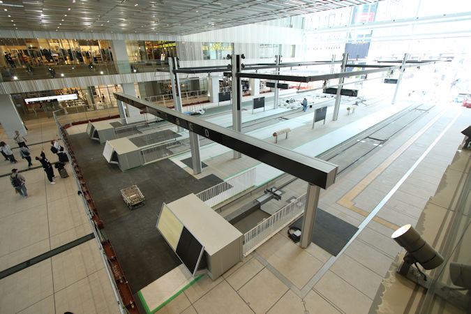 新しい稲荷町電停。路面電車らしからぬ長大なホーム。