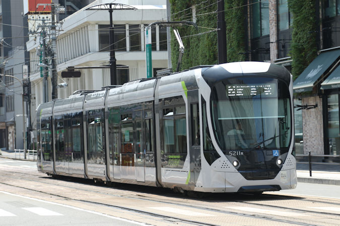 広島駅電停に停車中の5200形。路面電車の博物館的な雰囲気のあった広島電鉄も、多くが超低床車両に代わっています。